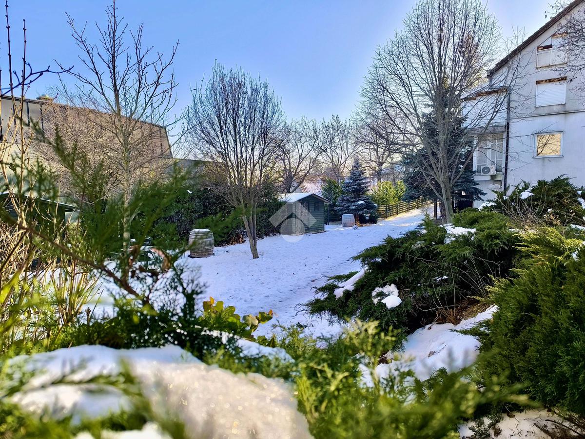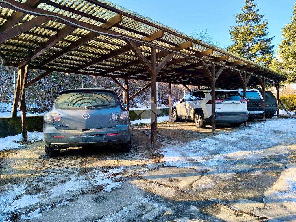 További előny, hogy a lakáshoz tartozik egy zárt és fedett gépkocsibeálló, valamint az udvaron egy 7 m²-es faház, amely ideális tárolásra, kerti eszközök elhelyezésére vagy akár hobbi célokra.